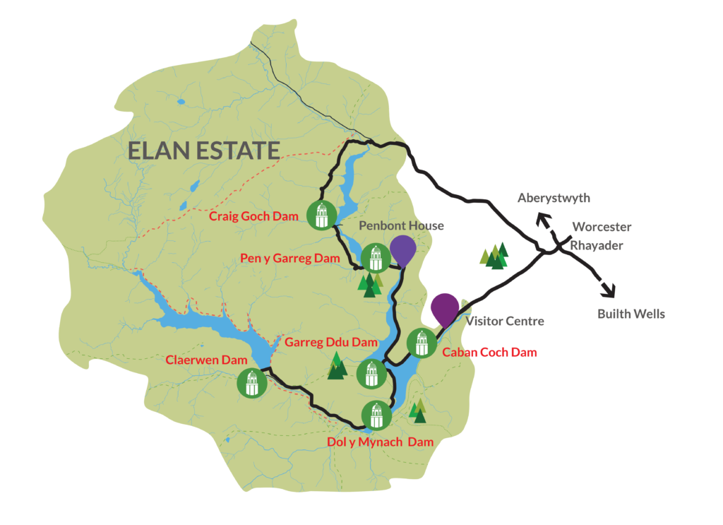 Si la zone d’Elan Valley fait plus d’une centaine de kilomètres carrés et offre un terrain de jeu presque infini à tous les promeneurs, sportifs et explorateurs, la partie réellement touristique est bien plus petite : elle se concentre entre le centre d’accueil des visiteurs, le barrage le plus à l’ouest, celui de Claerwen, et le barrage le plus au nord, celui de Craig Goch.