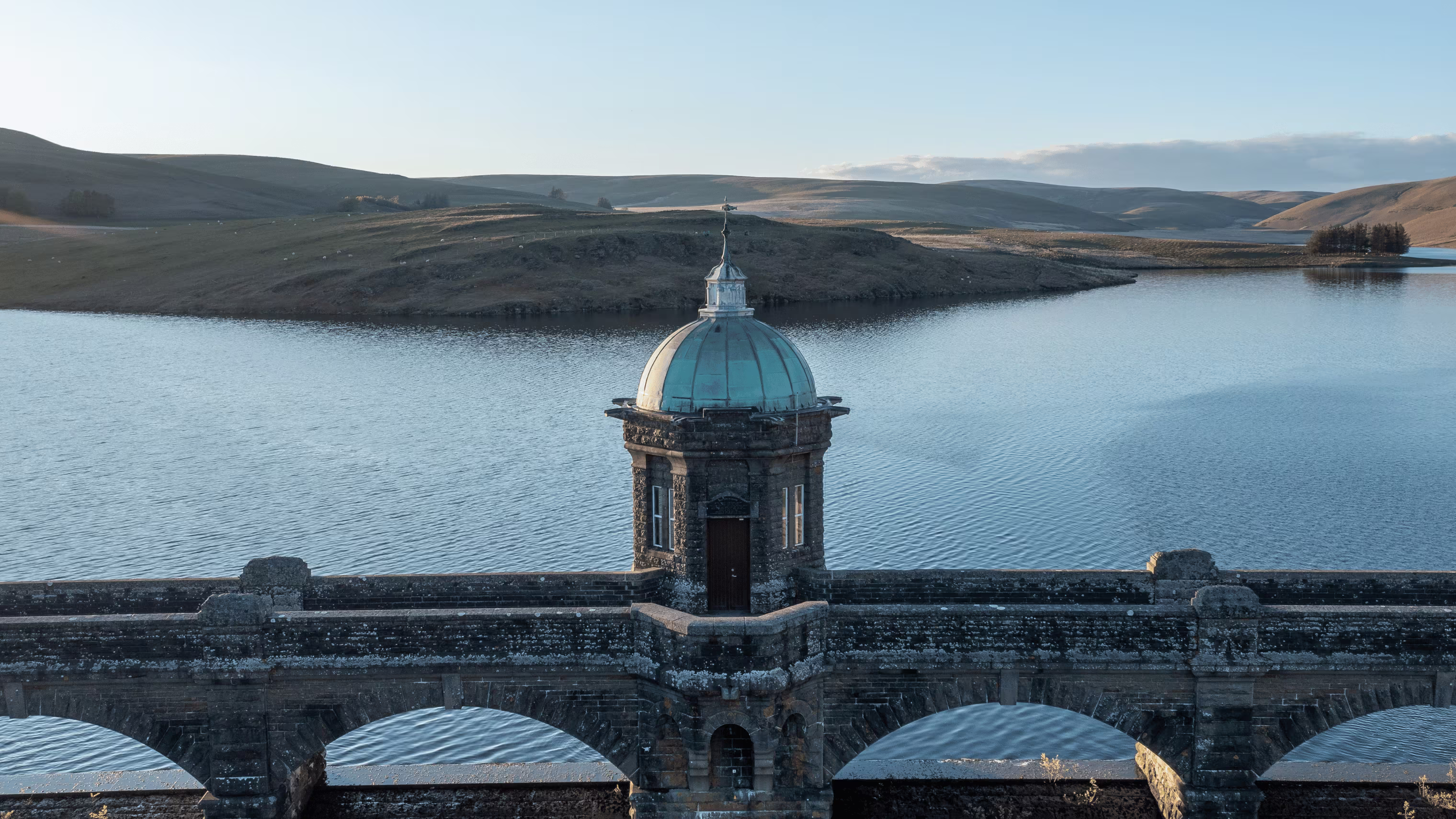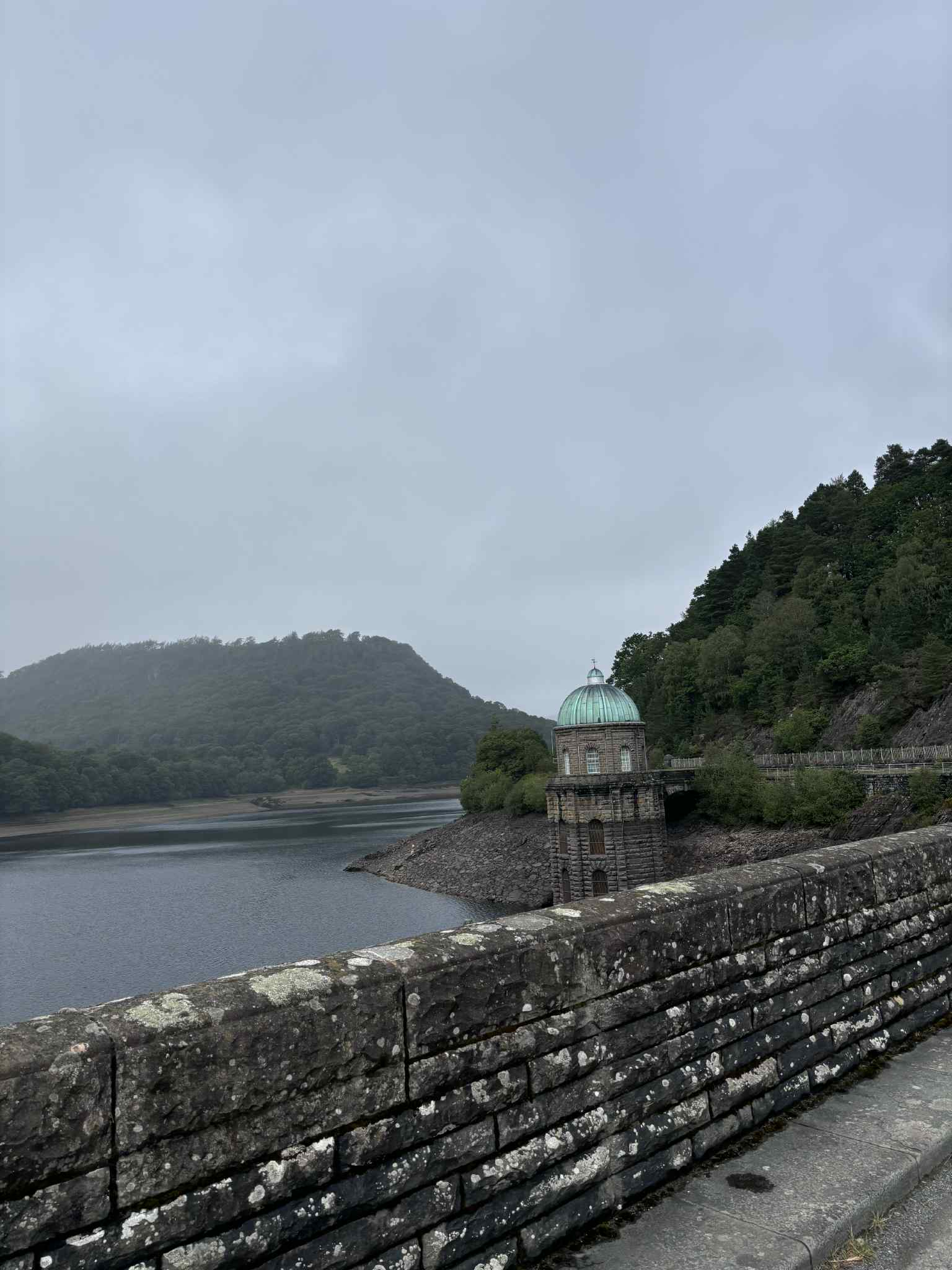 C’est l’image carte postale par excellence : un magnifique pont en pierre avec un mur incurvé et des petites arches qui soutiennent une chaussée goudronnée pleine de cachet, une vue à des kilomètres sur des collines galloises toutes plus belles les unes des autres, le silence assourdissant et cette sensation de se sentir seul au monde. Le vide du barrage et de la vallée derrière nous et l’immensité du paysage devant nous. Un cri de mouton au loin interrompt parfois notre exploration silencieuse des lieux.